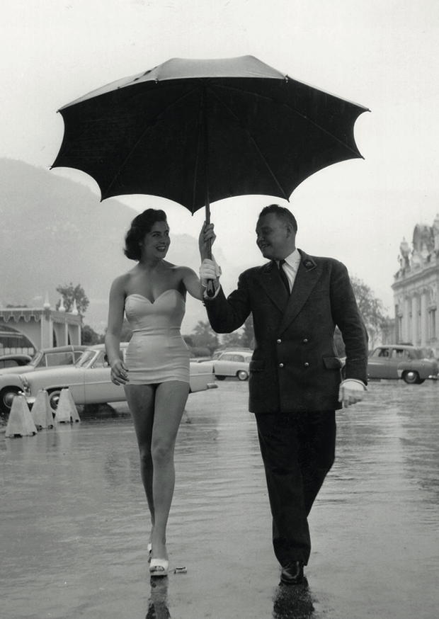 Ein Mann hält einen großen, schwarzen Schirm über eine Frau, die ein kurzes, elegantes Kleid trägt. Die Umgebung ist nass, und die Wolken hängen tief.