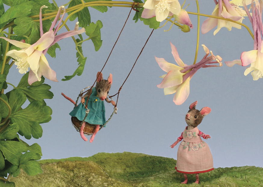Zwei Mäuse genießen den Tag im Freien, während eine von ihnen fröhlich auf einer Schaukel schwingt und die andere daneben steht und zuschaut.