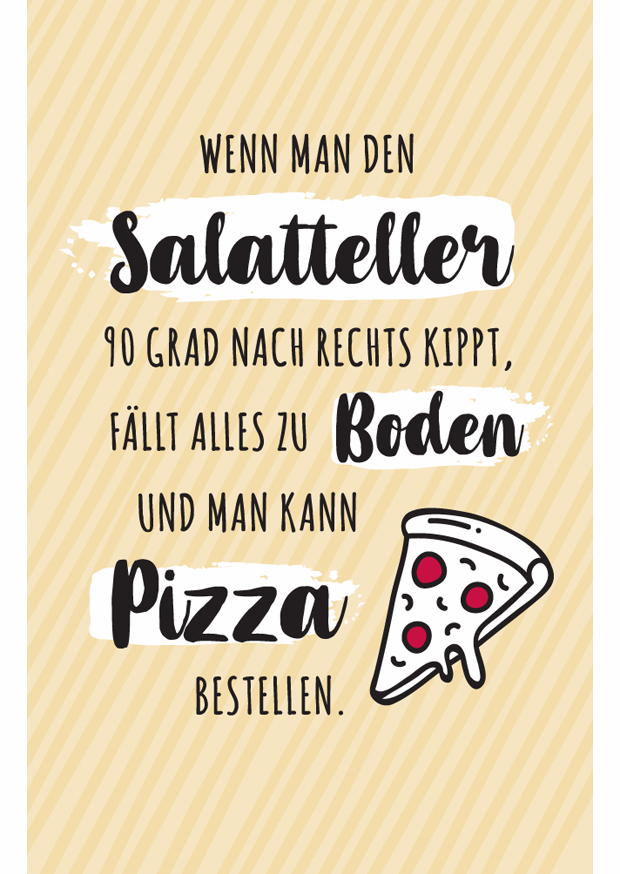 Der Spruch beschreibt humorvoll, was passiert, wenn ein Salatteller umkippt. Alles fällt zu Boden und es wird zur Pizza aufgerufen.
