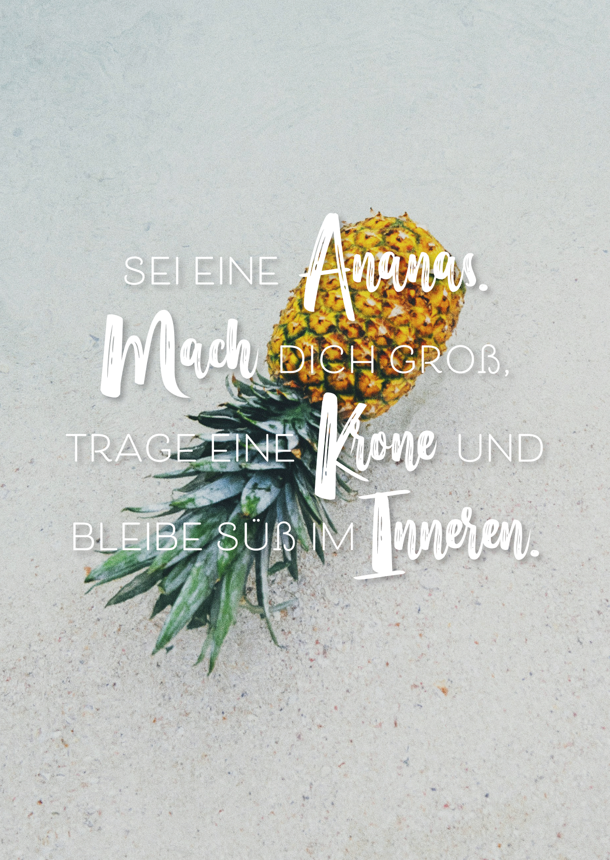Eine Ananas liegt auf hellem Sand, umgeben von grünen Blättern. Ein inspirierendes Zitat fordert dazu auf, groß zu denken und innere Stärke zu bewahren.