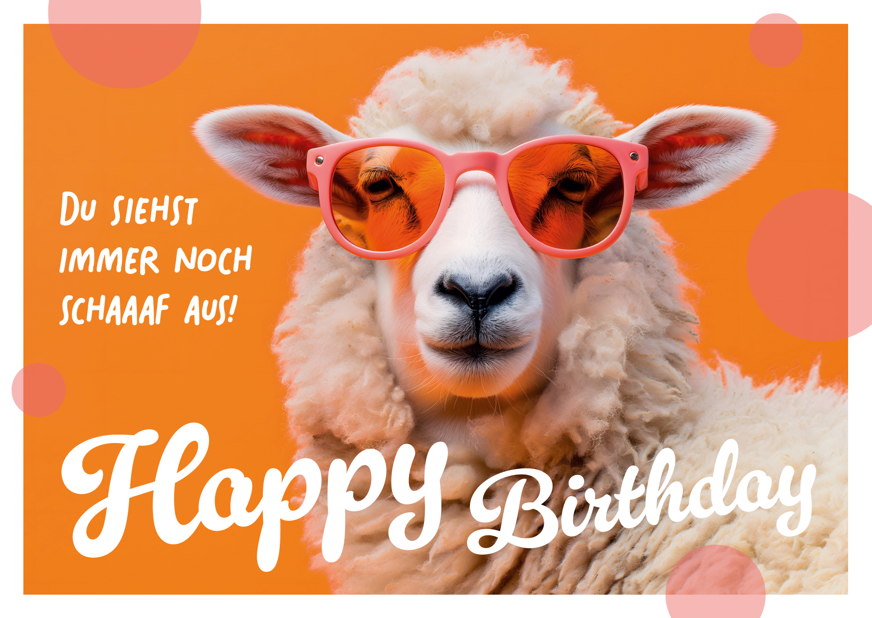 Ein Schaf trägt orangefarbige Sonnenbrillen und ist vor einem leuchtend orangefarbenen Hintergrund abgebildet. Es ist ein lustiges Geburtstagsgrussbild mit fröhlicher Botschaft.