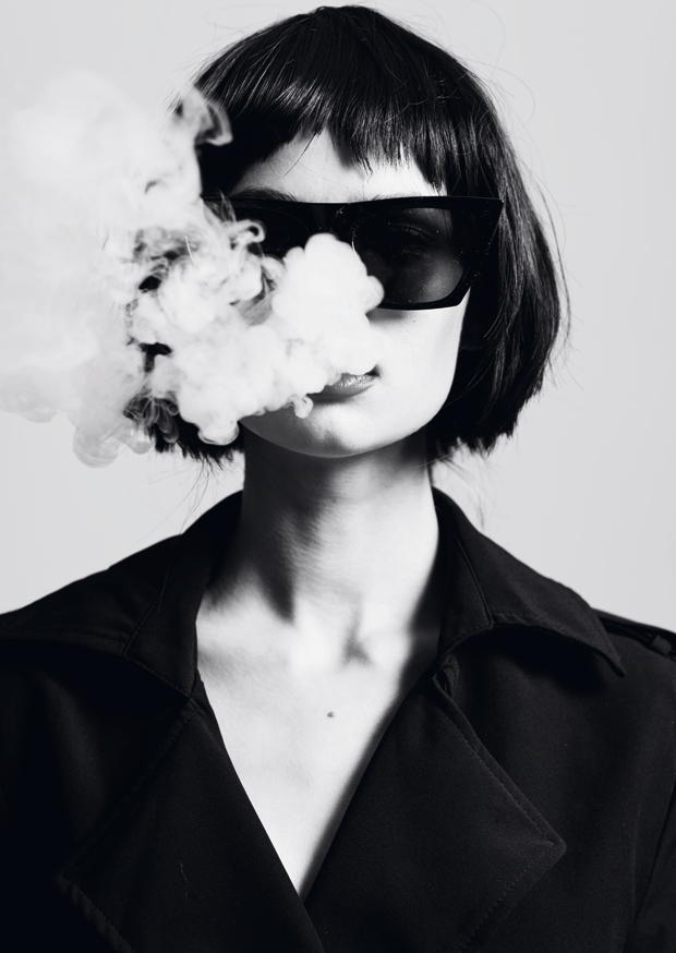 Eine junge Frau mit einem modernen Kurzhaarschnitt trägt stilvolle Sonnenbrillen und lässt Rauch aus ihrem Mund aufsteigen. Der Hintergrund ist schlicht und monochrom.