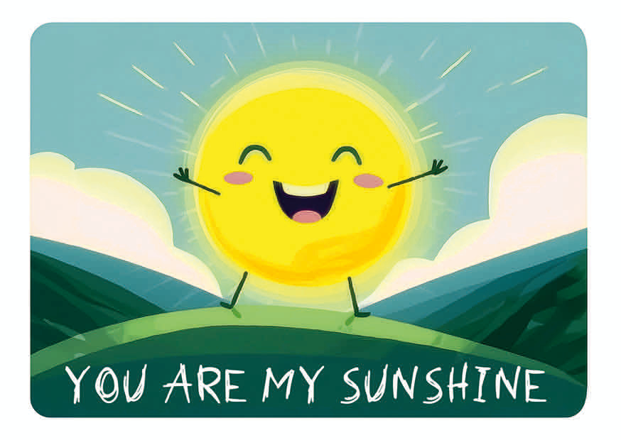 Eine sonnige, lächelnde Sonne mit ausgeprägtem Gesicht steht auf einem grünen Hügel. Im Hintergrund sind sanfte Hügel und ein klarer blauer Himmel sichtbar.