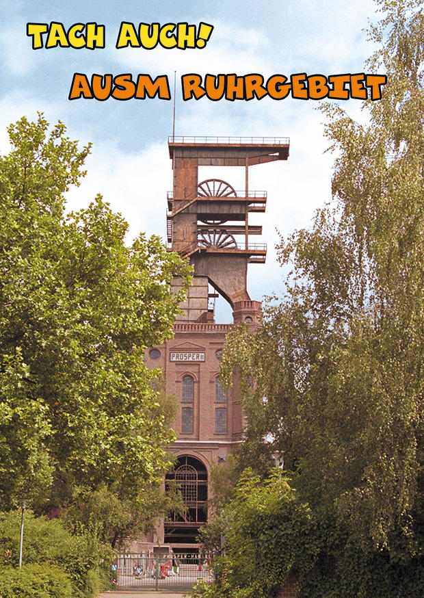 Das beeindruckende Fördergerüst steht stolz im Ruhrgebiet, umgeben von üppigem Grün. Die Bäume spenden Schatten, während die Sonne auf die Umgebung scheint und die Industriekultur widerspiegelt.
