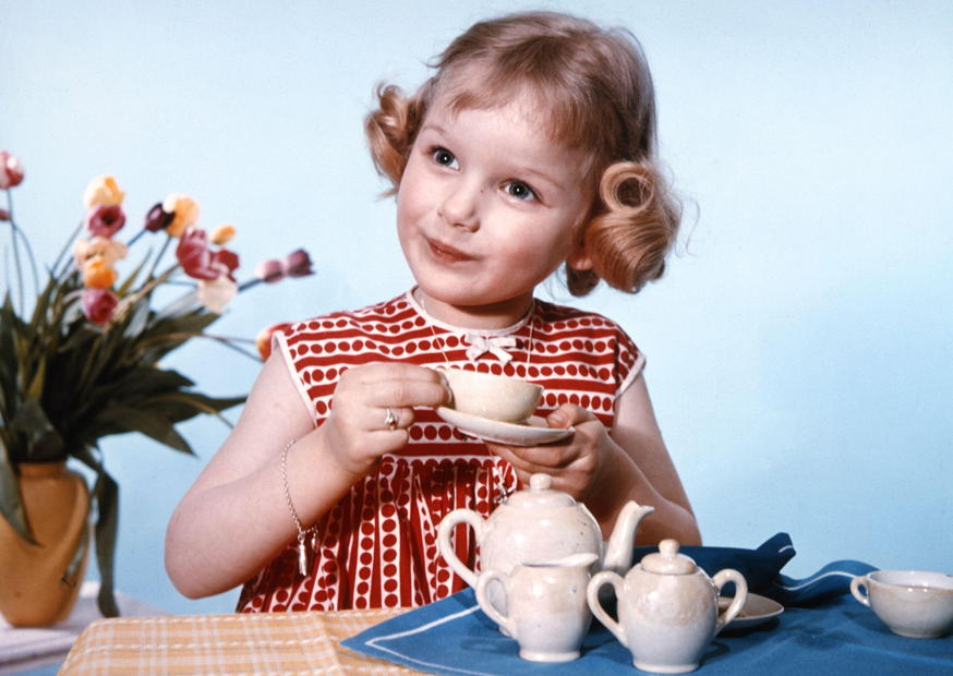 Ein fröhliches Mädchen mit Locken sitzt am Tisch, genießt eine Teeparty und hält eine kleine Tasse in der Hand. Blumen im Hintergrund setzen farbige Akzente im Raum.