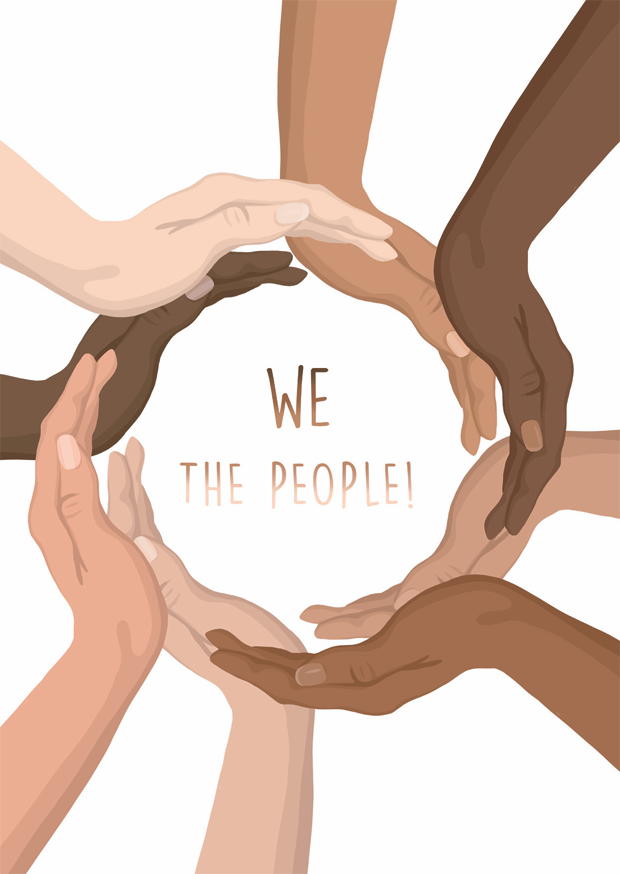 Verschiedene Hände, in einem gleichmäßigen Kreis angeordnet, drücken Zusammenhalt und Vielfalt aus. Der Schriftzug „We the People“ verstärkt die Botschaft von Einheit und Inklusion.