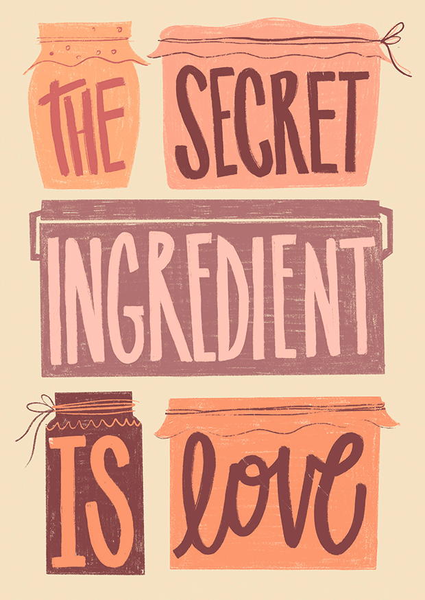 In einem liebevoll gestalteten Kunstwerk wird das Geheimnis für die besten Rezepte enthüllt. Die klare Botschaft betont die Bedeutung von Liebe in der Küche.