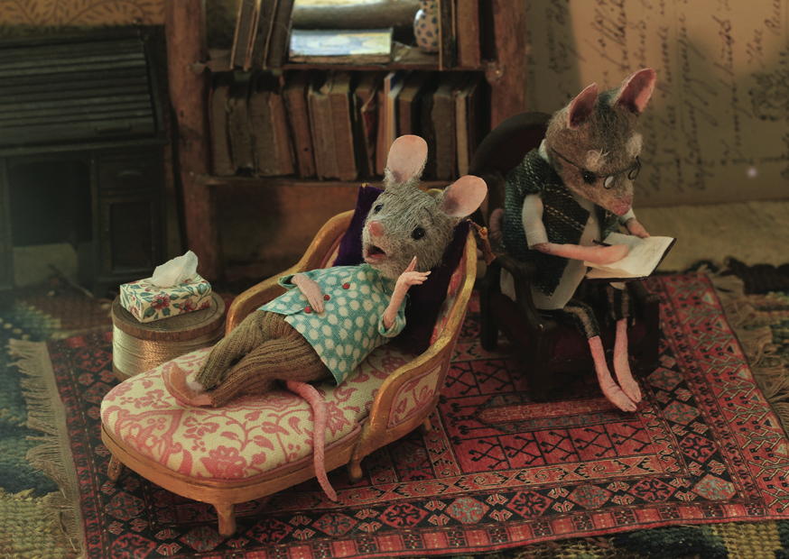 In einem warmen Raum sitzen zwei Mäuse. Die eine liegt entspannt auf einer Couch, während die andere mit einem Buch in der Hand aufmerksam liest.
