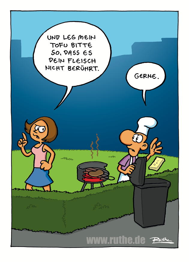 Eine Frau bittet einen Koch, ihr Tofu beim Grillen nicht mit dem Fleisch zu berühren. Dies führt zu einer witzigen Interaktion im Garten.