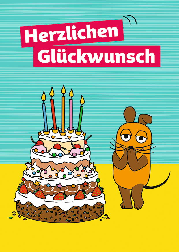 Die Maus zeigt einen dreistöckigen Geburtstagstorte mit Kerzen. Eine niedliche Maus steht daneben und bringt Glückwünsche zu diesem besonderen Anlass.