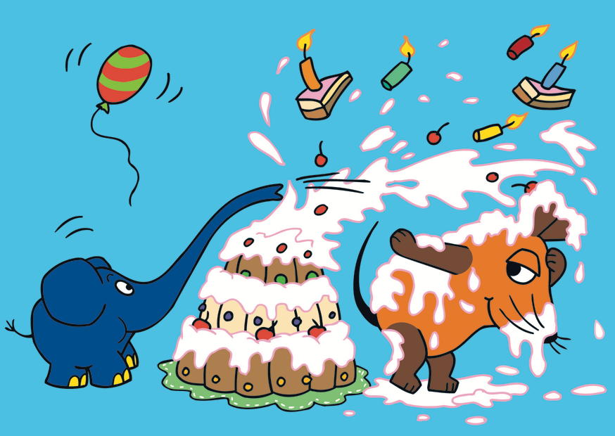 Ein Elefant und eine Maus haben Spaß bei einer Feier. Der Elefant spritzt Sahne auf die Maus und eine bunte Torte steht auf dem Tisch. Luftballons und Kerzen verleihen der Szene Freude.