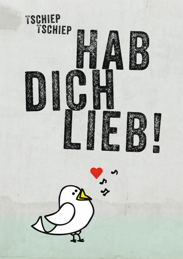 Ein niedlicher Vogel singt fröhlich mit einem Herz über seinen Kopf. Die Schriftzüge sind kreativ gestaltet und vermitteln eine Botschaft der Liebe. Ideal für romantische Anlässe.