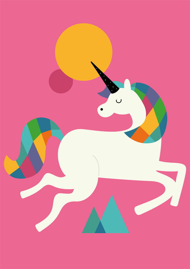 Ein fröhliches Einhorn mit einer bunten Mähne springt über stilisierte geometrische Formen. Der Hintergrund strahlt in lebhaften Pink- und Gelbtönen, was eine verspielte Atmosphäre erzeugt.