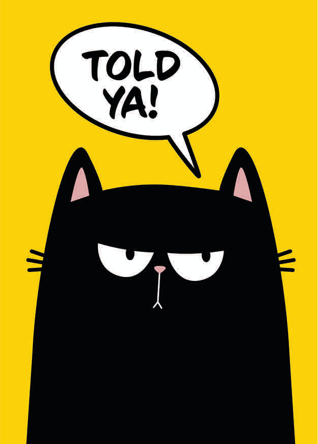 Eine schwarze Katze mit einem missmutigen Gesichtsausdruck steht vor einem leuchtend gelben Hintergrund. Sie hat eine Sprechblase, in der „Told ya!“ steht, was ihre Unzufriedenheit zeigt.