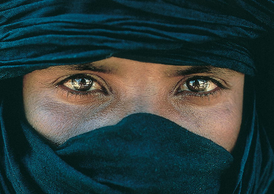 Die Person trägt ein schwarzes Tuch, das das Gesicht teilweise verdeckt, und hat ausdrucksvolle Augen, die die Umgebung beobachten. Ein faszinierender Moment in der Wüste.