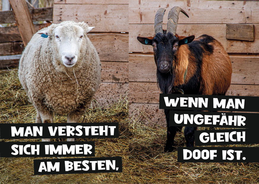 Ein Schaf und eine Ziege stehen nebeneinander im Stall und kommunizieren auf humorvolle Weise über das Verständnis unter Tieren in der Natur.