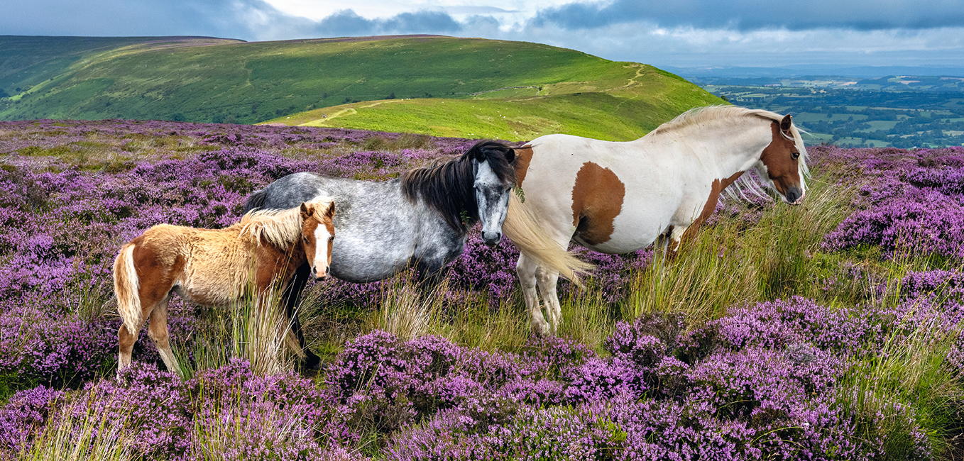 Drei Pferde grasen friedlich auf blühenden Heideflächen, umgeben von sanften Hügeln. Die Landschaft zeigt eine blühende Natur in einem ruhigen Tal.