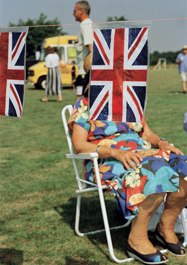 Im Park genießt eine Frau in einem bunten Kleid das sonnige Wetter, während Feierlichkeiten mit britischen Flaggen im Hintergrund stattfinden. Menschen sind aktiv und freuen sich.