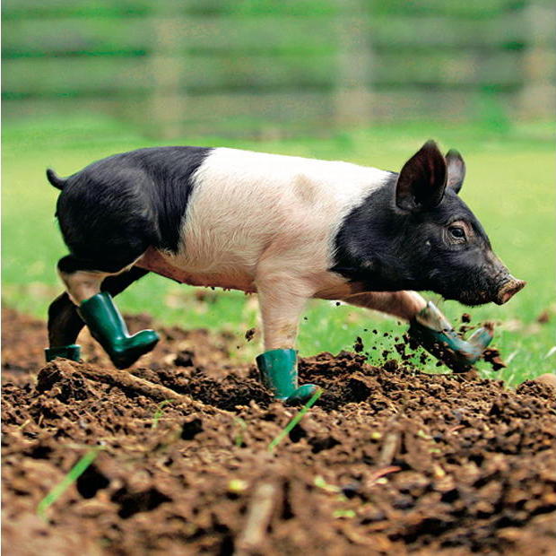 Ein kleines Schwein mit grünen Gummistiefeln läuft fröhlich über einen erdigen Boden in einem landwirtschaftlichen Bereich an einem sonnigen Tag.