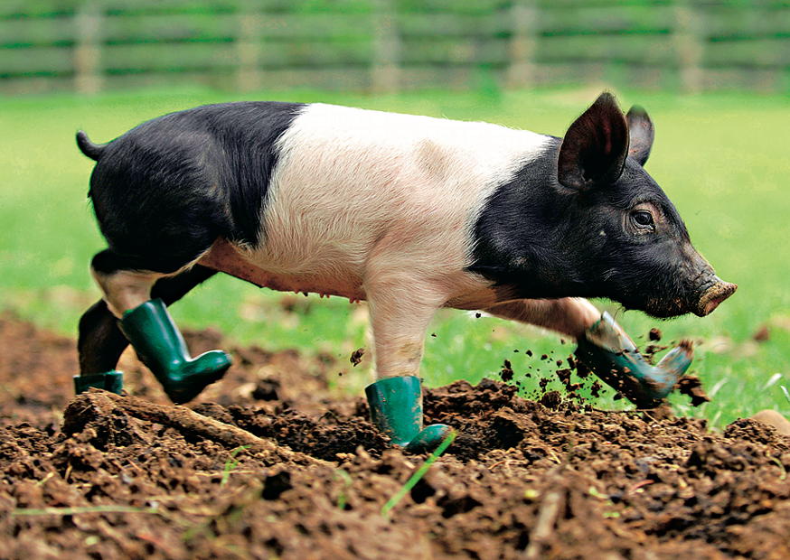 Auf einem Bauernhof läuft ein niedliches Schwein fröhlich durch das Gras. Es trägt Gummistiefel und gräbt im Boden, während die Sonne strahlt.