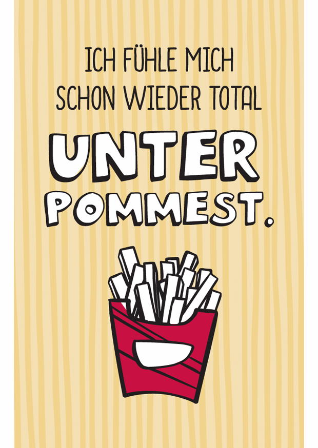 Das Kunstwerk zeigt einen roten Pommesbecher mit einem witzigen Spruch darüber, sich wieder einmal unter Pommes zu fühlen. Eine humorvolle Illustrationsidee.