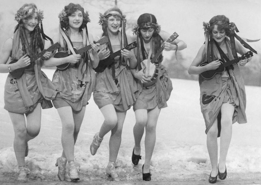 Fünf Frauen in fröhlichen Outfits stehen im Schnee und spielen Ukulele. Sie strahlen Freude aus und scheinen einen unterhaltsamen Moment zu genießen, während sie zusammen singen.