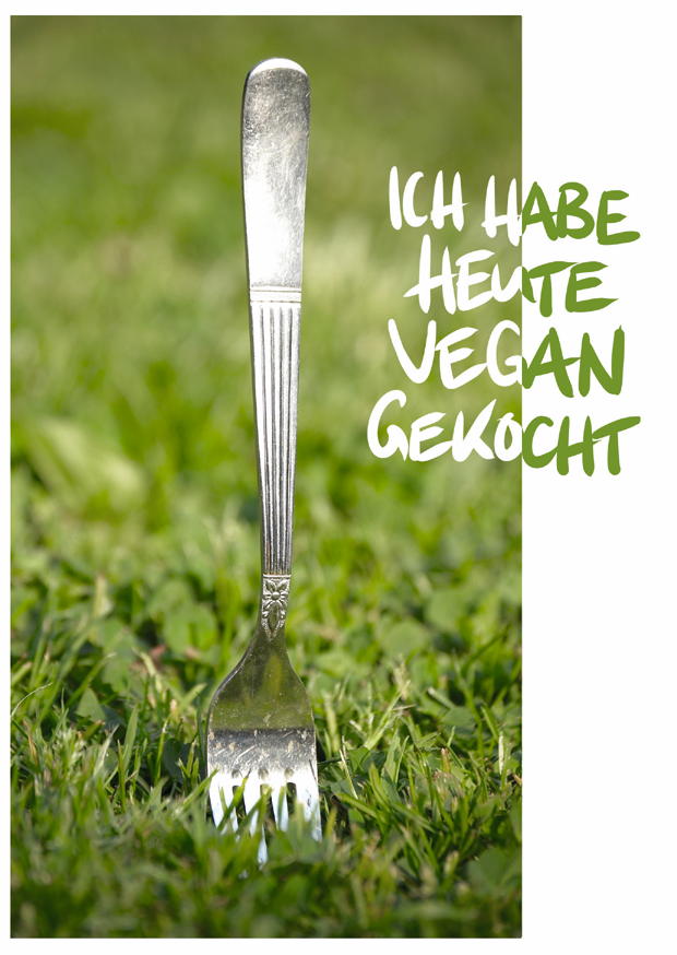 Auf dem grünen Gras steht eine Gabel. Der Text daneben deutet darauf hin, dass heute ein veganes Gericht zubereitet wurde. Ein Bezug zur Natur und gesunder Ernährung.