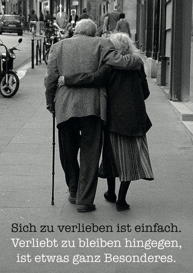 Ein älteres Paar, eng umschlungen, spaziert liebevoll durch eine charmante Straße. Die Sonne scheint und verleiht der Szene eine warme Atmosphäre.