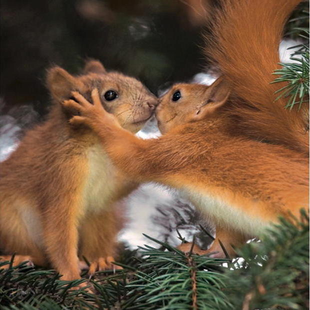Zwei junge Eichhörnchen stehen auf einem niedrigen Ast und drücken sanft ihre Nasen aneinander, während sie sich in der warmen Frühlingssonne umarmen.