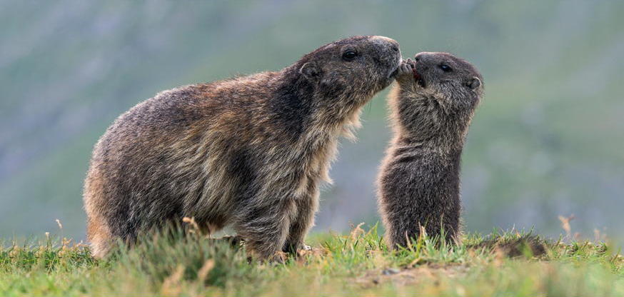 Eine Mutter-Murmeltier und ihr Junges genießen die warmen Strahlen der Frühlingssonne auf einer grünen Wiese in den Alpen und zeigen ihre Zuneigung zueinander.