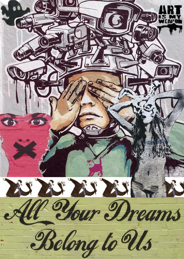 An einer Wand ist ein eindrucksvolles Kunstwerk zu sehen, das eine Botschaft über Überwachung und Kontrolle in der modernen Gesellschaft vermittelt.