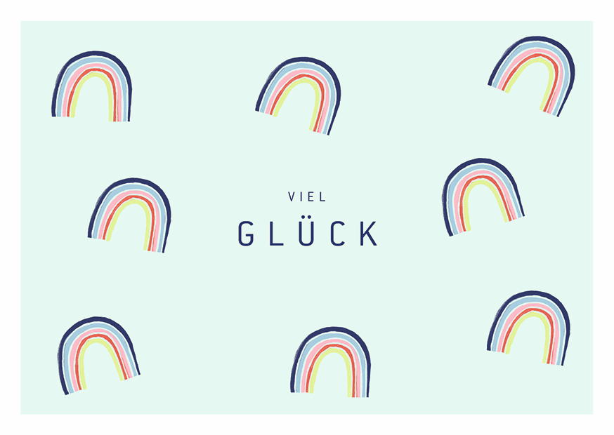 Bunte Regenbögen schmücken den Hintergrund, während der Schriftzug Viel Glück in der Mitte steht und positive Stimmung verbreitet.