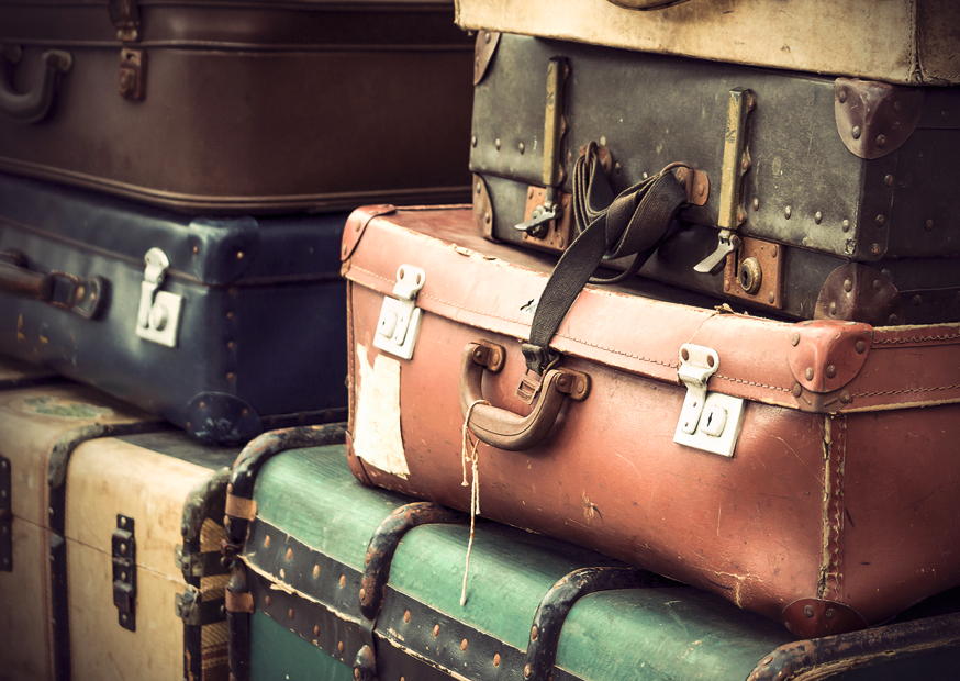 Die Koffer sind in verschiedenen Farben und Materialien gestaltet, übereinander gestapelt und vermitteln ein Gefühl von Nostalgie und Abenteuer.