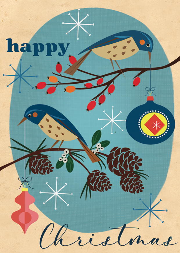 Zwei bunte Vögel sitzen auf einem Ast und genießen die Weihnachtsatmosphäre, umgeben von glänzenden Weihnachtskugeln und Schneeflocken.