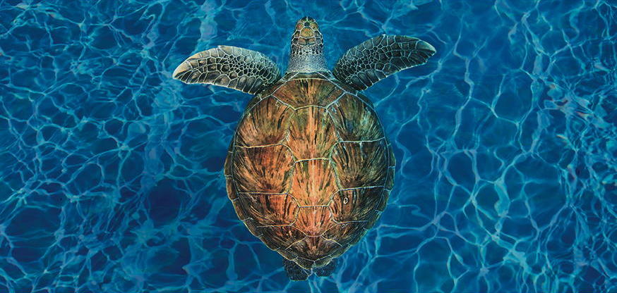 Die Meeresschildkröte bewegt sich elegant durch das funkelnde Wasser des Ozeans, während die Sonne über ihr strahlt und die Wellen sanft plätschern.