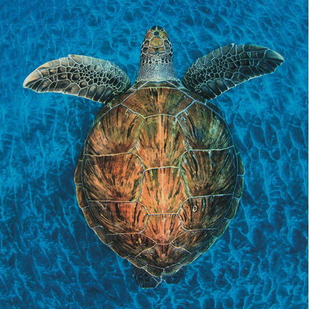 Die Meeresschildkröte gleitet sanft durch das türkisblaue Wasser, umgeben von einer friedlichen Unterwasserwelt, während Sonnenstrahlen die Wasseroberfläche durchdringen.
