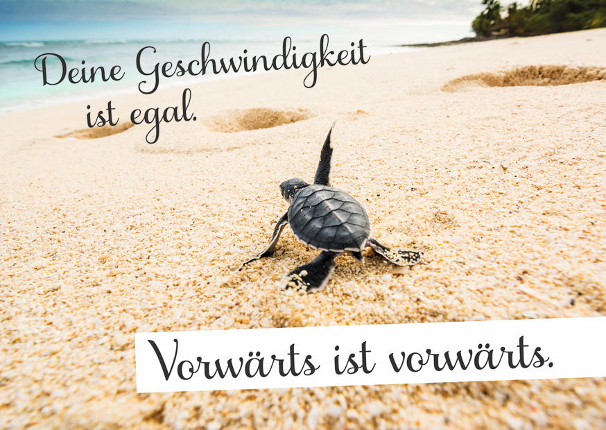 Eine kleine Schildkröte bewegt sich über den warmen Sandstrand während der Morgendämmerung. Der Schriftzug ermutigt dazu, nach vorne zu schauen und Geduld zu haben.