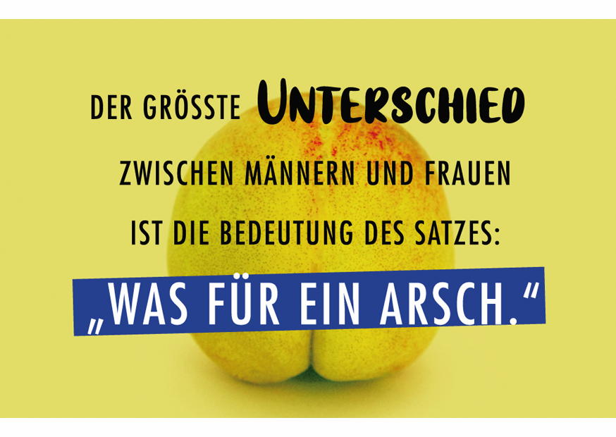 Diese Grafik zeigt den humorvollen Unterschied in der Interprétation eines Satzes zwischen Männern und Frauen. Auf einem kräftigen, gelben Hintergrund wird der Text gut lesbar präsentiert.