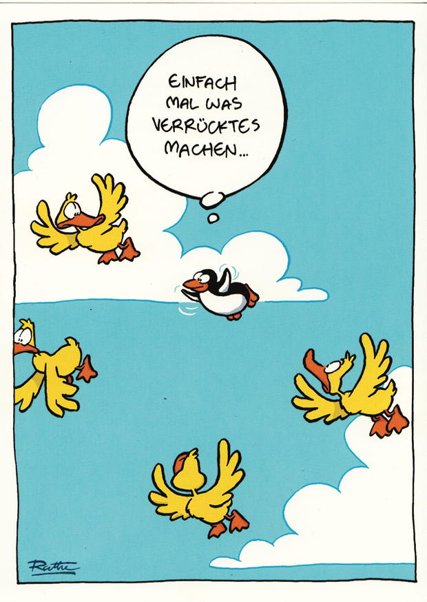 Eine Gruppe von fliegenden Vögeln schwebt über den Wolken. Ein Pinguin sitzt in der Mitte und ein Vogel spricht darüber, etwas Verrücktes zu machen.