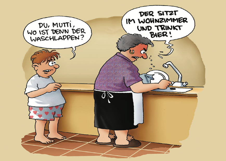 Ein Junge steht in Unterwäsche in der Küche und fragt seine Mutter nach dem Waschlappen, während sie Geschirr spült und einen humorvollen Kommentar abgibt.