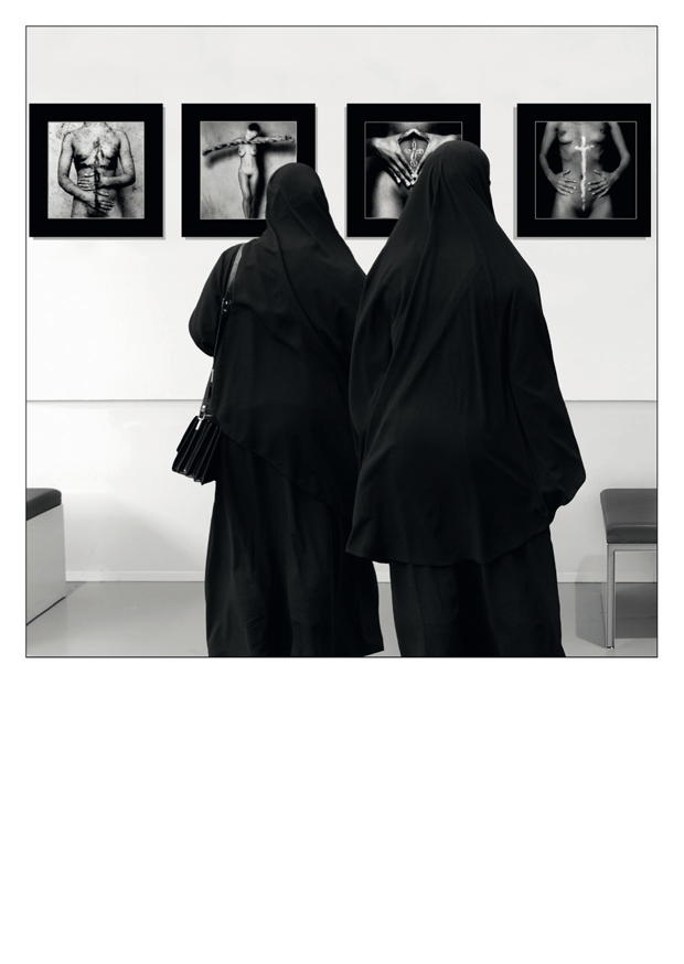 Zwei Frauen in schwarzer Kleidung stehen vor einer Wand mit mehreren Fotografien, die menschliche Körper in verschiedenen Perspektiven darstellen. Es ist eine moderne Galerie.