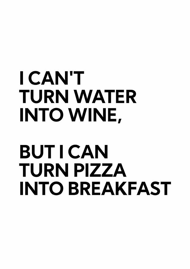 Ein humorvoller Spruch thematisiert die Liebe zur Pizza und deren Verwandlung in ein köstliches Frühstück, ideal für Pizza-Fans.