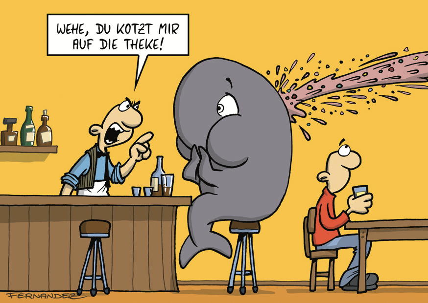 In einer Bar beschwert sich der Barkeeper über einen Wal, der auf die Theke spuckt. Ein Gast sitzt unbeeindruckt am Tisch und beobachtet das Geschehen.
