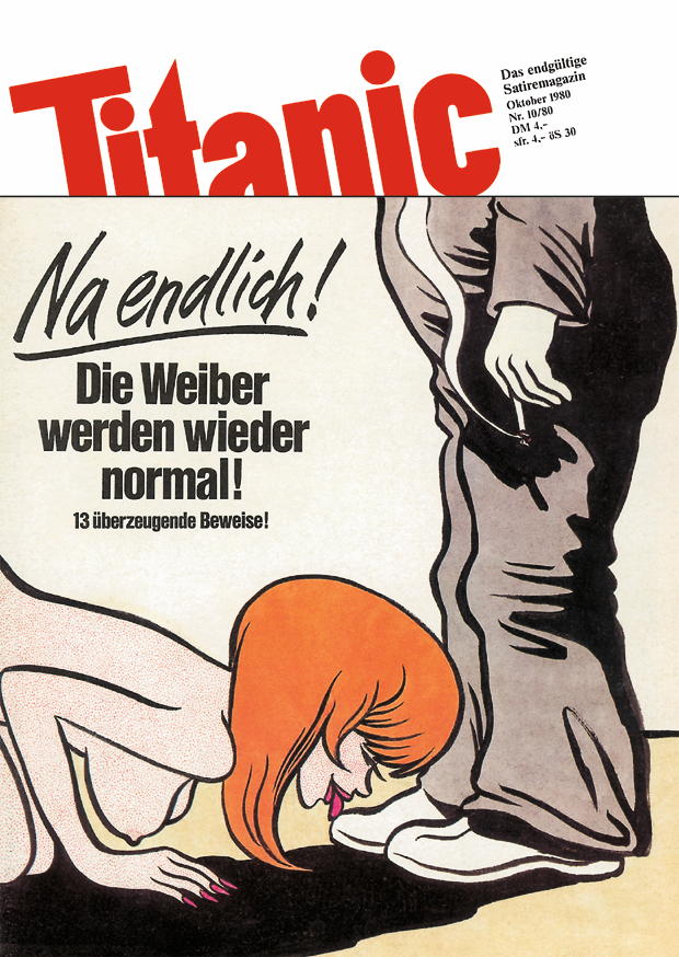 Auf dem Magazincover wird eine provokante satirische Darstellung gezeigt, die gesellschaftliche Themen zur Frauenrolle und Geschlechterverhältnisse behandelt.