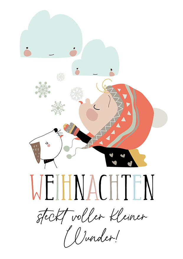 Ein fröhliches Kind mit einem bunten Schal bläst in die kalte Luft, während ein Hund daneben steht. Schneeflocken und Wolken hängen über ihnen. Weihnachten bringt fröhliche Momente.