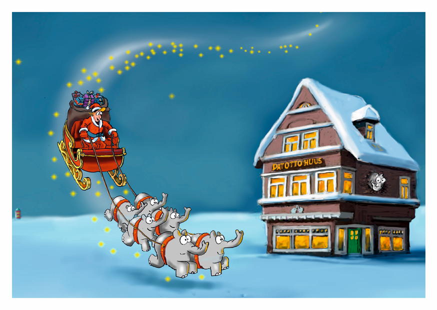 Der Weihnachtsmann fliegt mit seinem Schlitten durch den klaren, verschneiten Himmel, während fröhliche Elefanten ihm folgen. Im Hintergrund ist ein weihnachtlich dekoriertes Haus zu sehen.