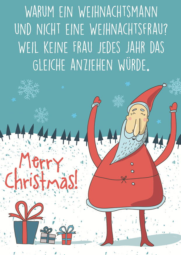 In einer verschneiten Winterlandschaft steht ein fröhlicher Weihnachtsmann, der Geschenke bei sich hat und einen humorvollen Spruch über die Kleidung von Frauen an Weihnachten äußert.