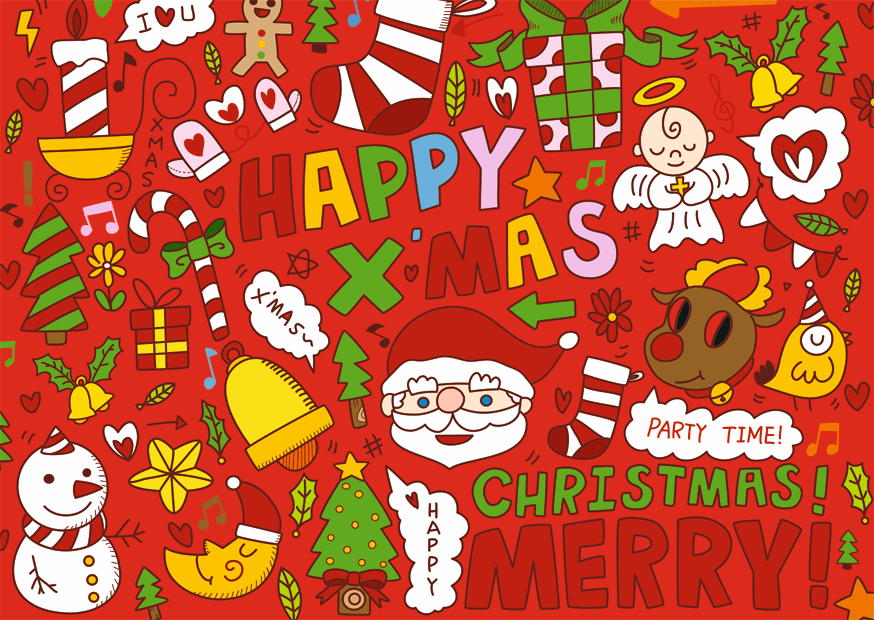Eine lebendige Collage zeigt weihnachtliche Motive wie Weihnachtsmann, Schneemann und Glocken, die eine fröhliche Stimmung zu feiern scheinen.