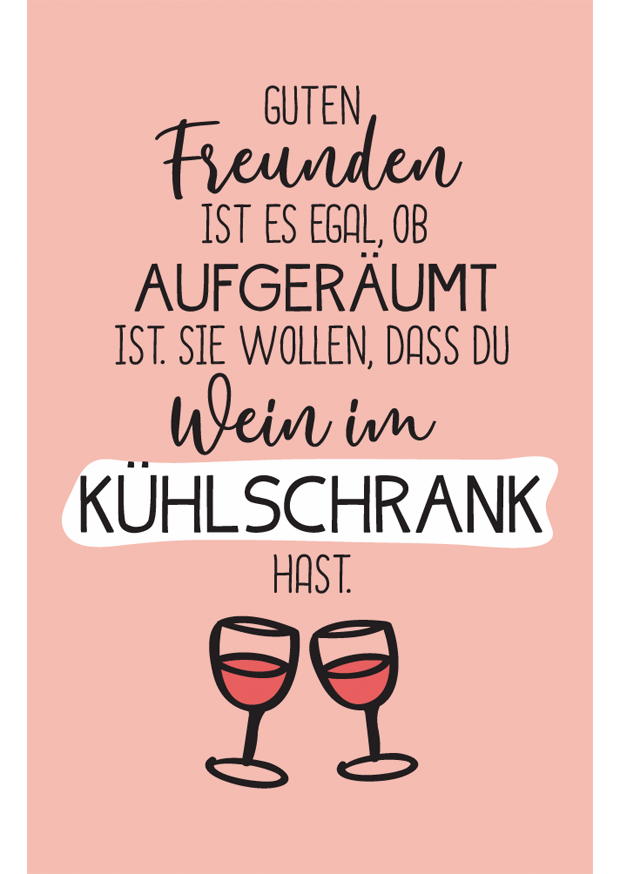 Ein humorvolles Zitat über wahre Freundschaft, das betont, dass es Freunden egal ist, ob es ordentlich ist, solange der Wein bereitsteht.
