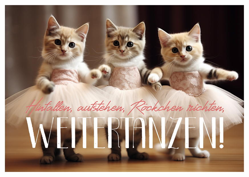 Drei Katzen in hübschen Ballettkleidern stehen aufrecht und tanzen begeistert im Wohnzimmer. Ihre verspielte Ausstrahlung zaubert jedem ein Lächeln ins Gesicht.